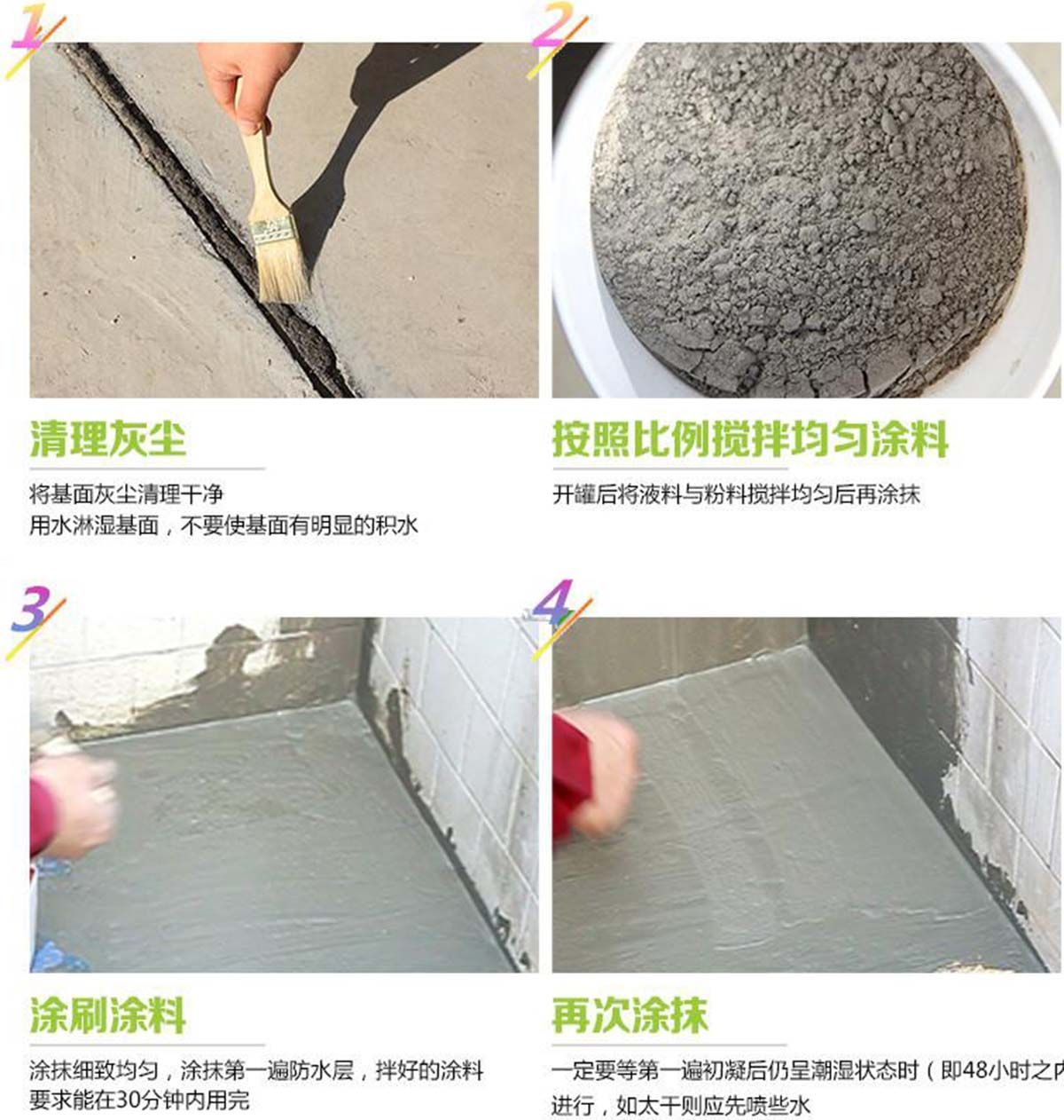 底層必須完全固化、完好、沒有灰塵,清除浮漿、油、油脂、脫膜劑及其它會影響防水效果