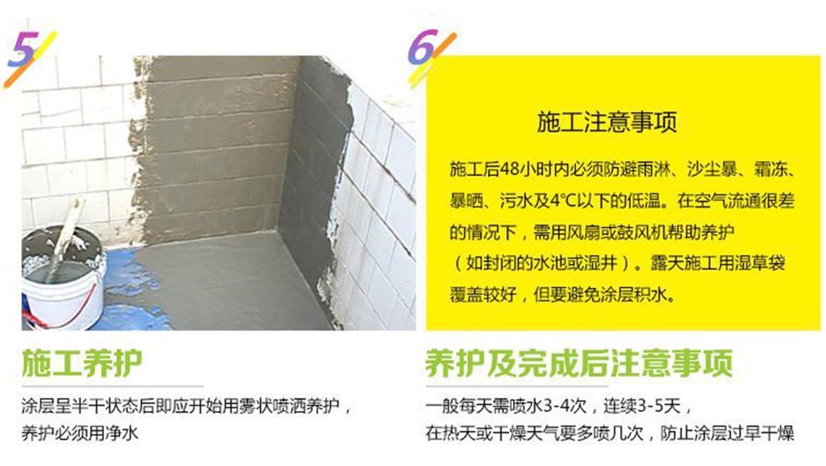 正確的固化對確保砂漿層的耐久性和質量是非常重要的。為了防止涂層表面產生裂縫、粉化,防水涂料涂層應保持潮濕,一旦施工后防水材料涂層開始固化即需開始養護,用噴霧水對防水材料涂層進行噴淋,一天需噴3~4次,如天熱,須增加噴淋的次數。施工后兩天內必須防雨淋、風沙、污水及霜凍。對于需要盛裝液體的混凝土構件,在養護三天后,再放置二周的時間,方可使用。